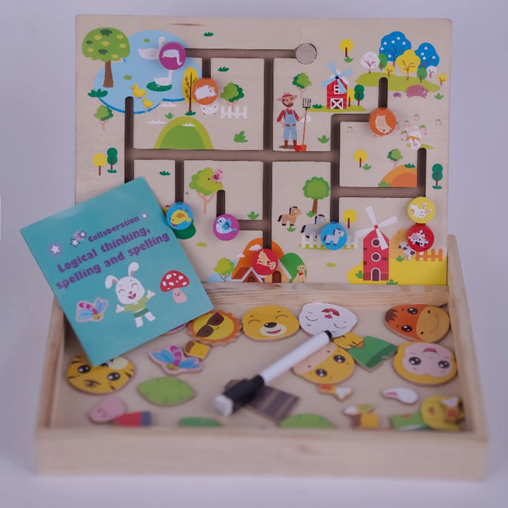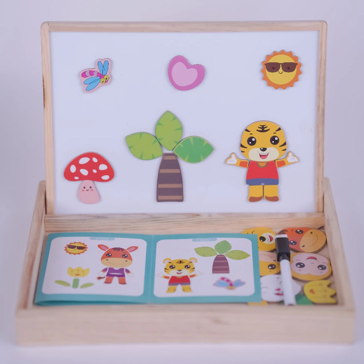 Included: Wooden board, whiteboard marker, mini whiteboard, character book, and wooden pieces